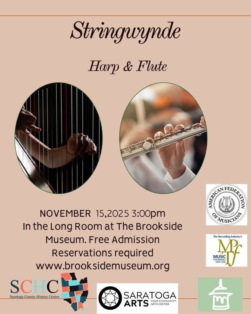 Stringwynde will be performing on November 15 at 3pm to start off the Third season of "Sounds in Winter" a music series presented in the historic Brookside Museum Long Room. Stringwynde's musicians are Melanie Chirignan on flute and Darhon Rees-Rohrbacher on harp. They have been performing together as Stringwynde for many years and embrace a wide variety of music. Stringwynde has been showcased in many performances across the Capital Region.This afternoons's program will include selections from American Folk music and also waltzes from the "Guilded Age." These concerts are sponsored jointly by The Ballston Spa Committee on the Arts, and The Saratoga County History Center with funding provided by The American Federation of Musicians Music Performance Trust Fund and a grant from Saratoga Arts. The concert is free, but registration is advised by going to www.brooksidemuseum.org.